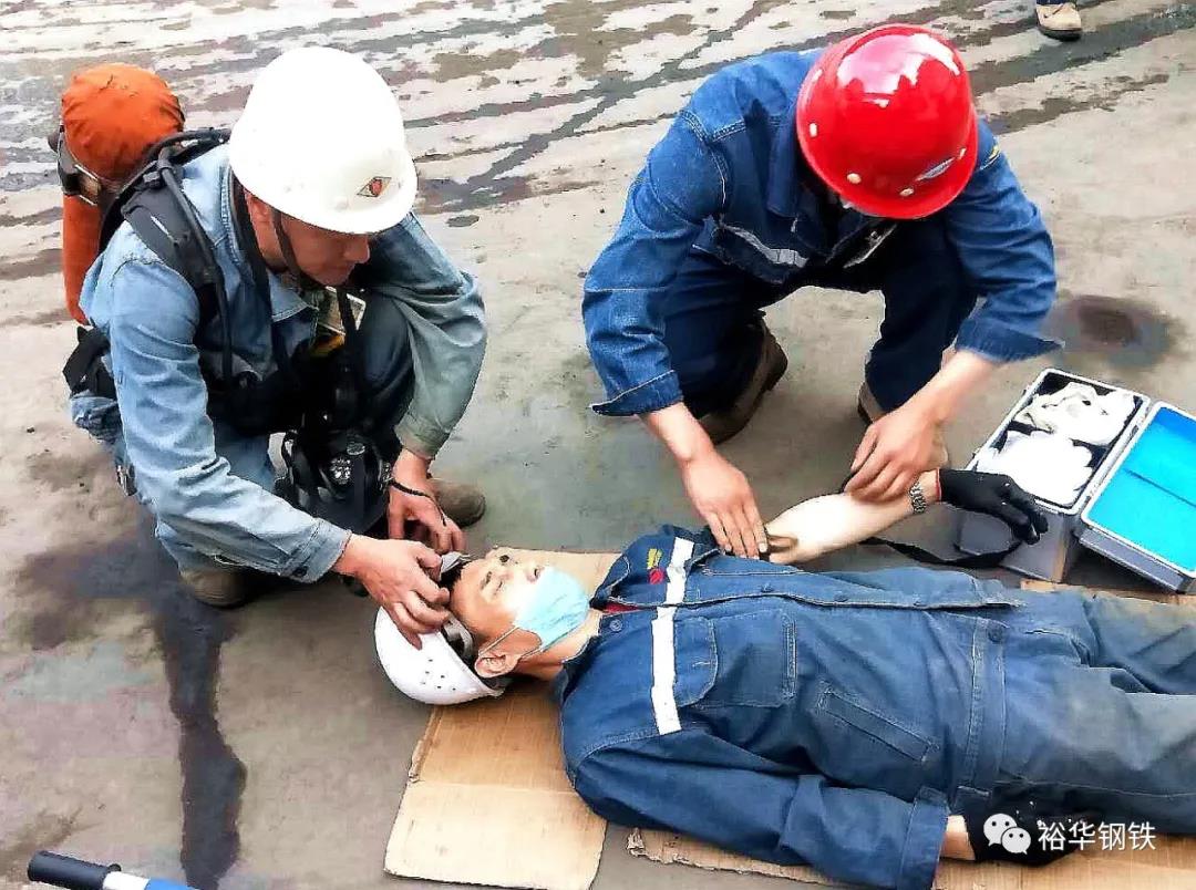 5月26日下午,現場總指揮發出演練開始的命令后,所有人員進入演習場景:兩名巡檢員在煤氣區發現1號煤氣水封處有兩人中毒,并立即戴好呼吸器向上級匯報請求救援,巡檢員首先將輕度中毒者攙扶到通風良好處,然后了解另一名重度員工傷勢情況并等待救援。
